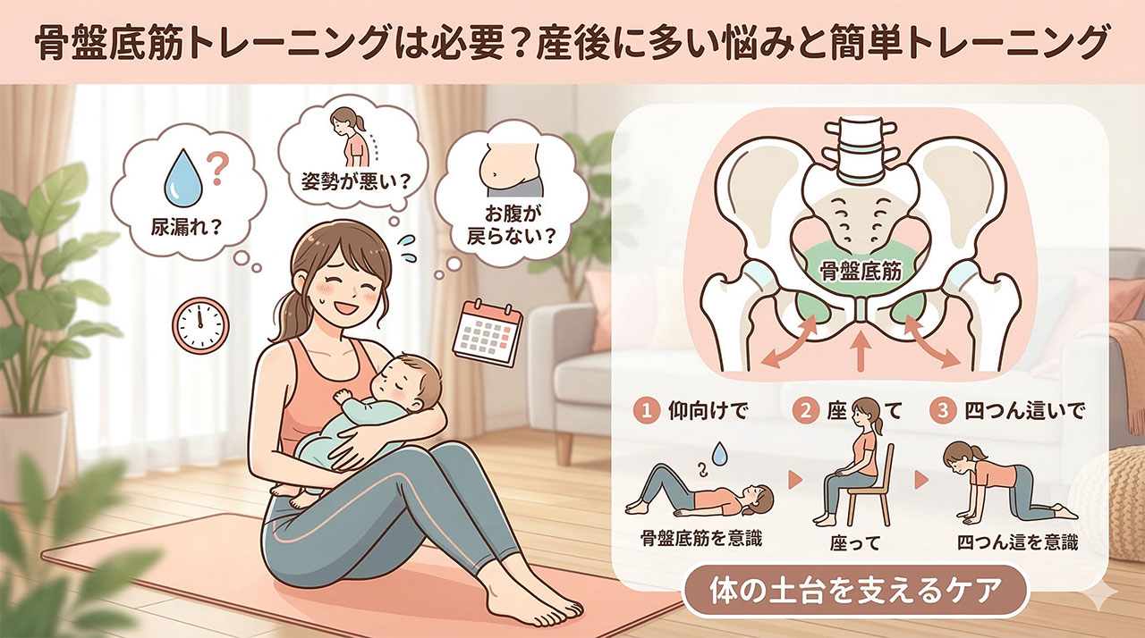 骨盤底筋は体の土台を支える筋肉の一つで、出産後に意識されることが多い部分です。