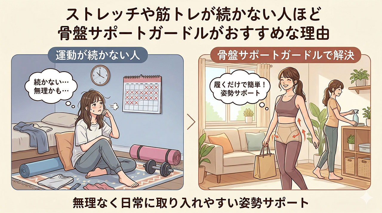 そのような場合は、無理なく日常に取り入れやすい方法を選ぶことも一つの考え方です。骨盤サポートガードルは、着用することで姿勢を意識しやすくするサポートアイテムです。
