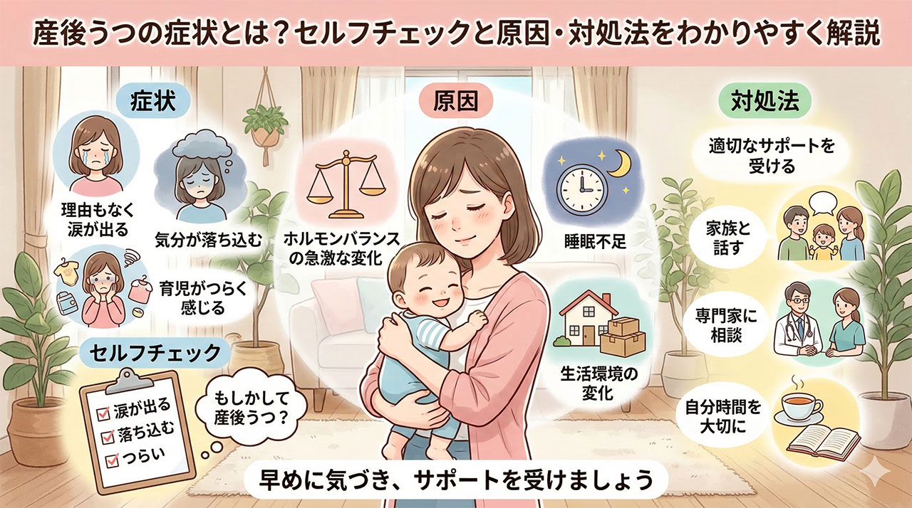 この記事では、産後うつの主な症状やセルフチェックのポイント、原因や対処法についてわかりやすく解説します。自分や家族の変化に気づいたときの参考にしてください。