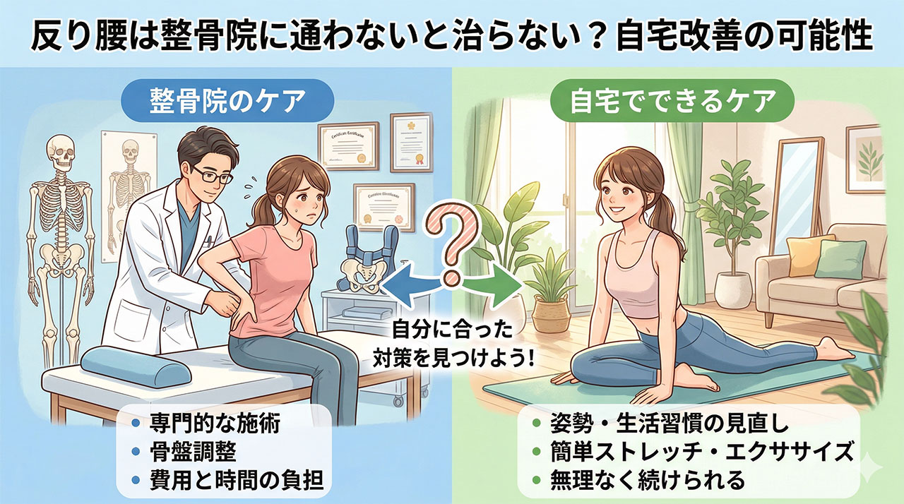 反り腰のケアは、整骨院に通う方法だけでなく、自宅での姿勢改善や生活習慣の見直しなど、さまざまな選択肢があります。大切なのは、自分のライフスタイルや続けやすさに合った方法を選ぶことです。