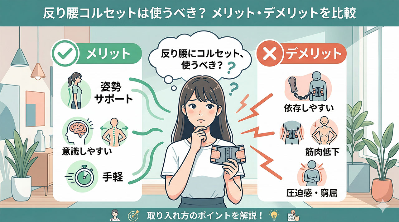 反り腰コルセットは、姿勢を意識するきっかけづくりや日常生活でのサポートとして取り入れやすい一方で、使い方によっては負担を感じる場合もあります。大切なのは、メリットとデメリットの両方を理解したうえで、自分に合った方法を選ぶことです。